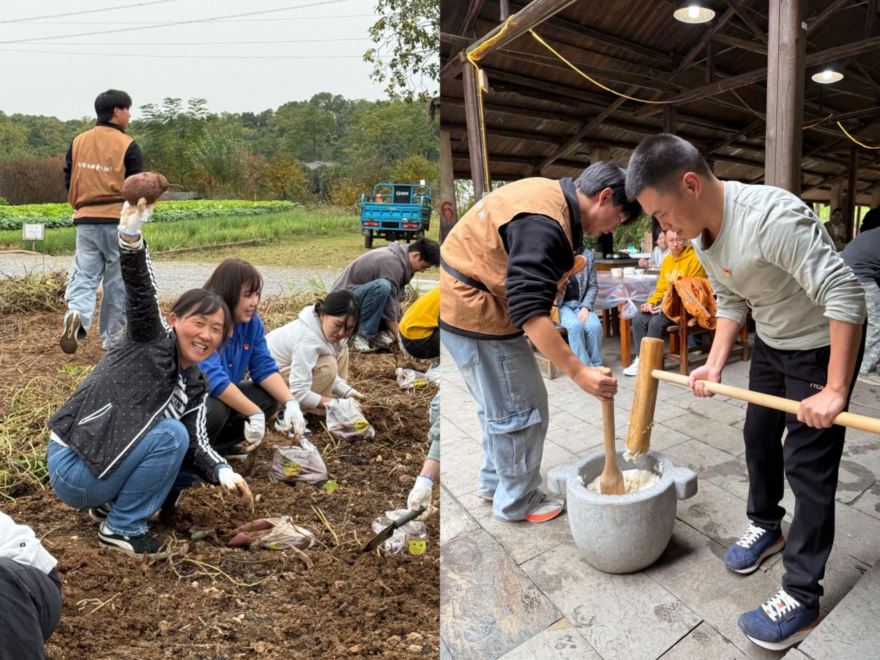 活动现场,师生党员热情高涨。打糍粑时,大家分工协作,教工掌槌控节奏,学生翻拌糯米,木槌撞击声与笑声交织。品尝着热糍粑,师生既体会到协作的力量,也传承了传统农耕智慧。在紫薯种植基地,师生党员们化身“农耕实践者”,在农技人员的指导下,手持小铲俯身田间,小心翼翼地拨开土壤,当一个个饱满的紫薯带着泥土的芬芳被挖出时,现场响起阵阵欢呼。“平时在实验室与数据打交道,今天在田间感受‘春种秋收’的自然法则,才真正理解‘每一份收获都来之不易’的道理。”统计学研究生党员李同学捧着亲手挖出的紫薯感慨道。教工党员们则结合自身工作经历,在劳动间隙与研究生交流职业规划,将思想引领融入田间地头的轻松对话中,实现了“劳动实践+思想引领”的有机融合。