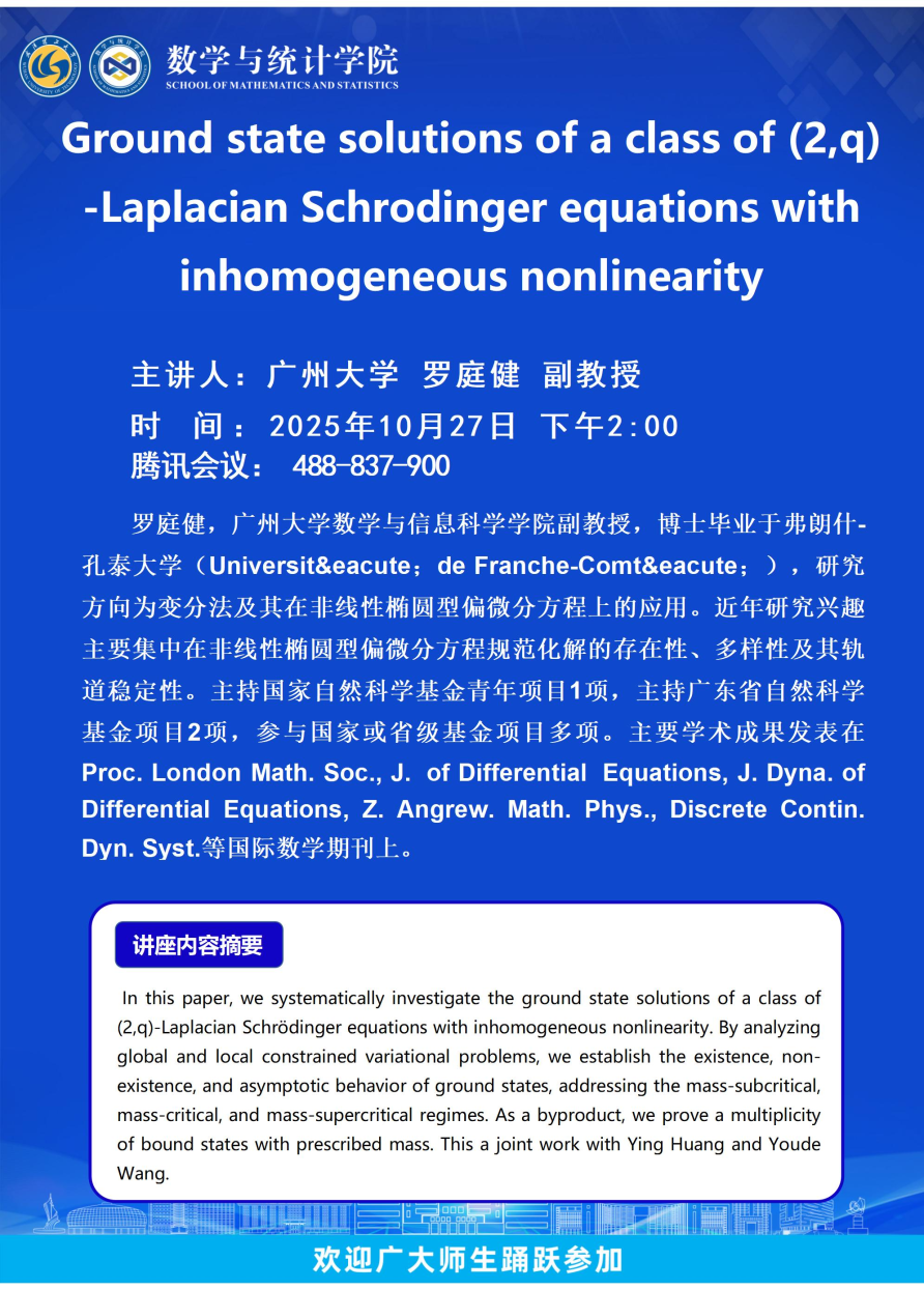 广州大学罗庭健副教授-Ground state solutions of a class of (2,q)-Laplacian Schrodinger equations with inhomogeneous nonlinearity 发布日期:2025-10-27