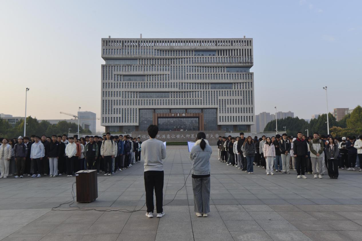 升旗仪式后,raybet雷竞技网站两名学生代表共同上台,深情演绎诗朗诵《青春中国》。朗诵中,以 “用茫茫的夜色作墨,用疮痍的土地作纸” 开篇,既回溯鸦片战争后祖国的苦难过往与先辈战火中的抗争精神,又展现新时代 “科技之花绽放、创新之潮澎湃” 的发展图景,更结合青年身份抒发接续奋斗的决心,朴实而真挚的话语引发在场师生共鸣,现场响起热烈掌声。