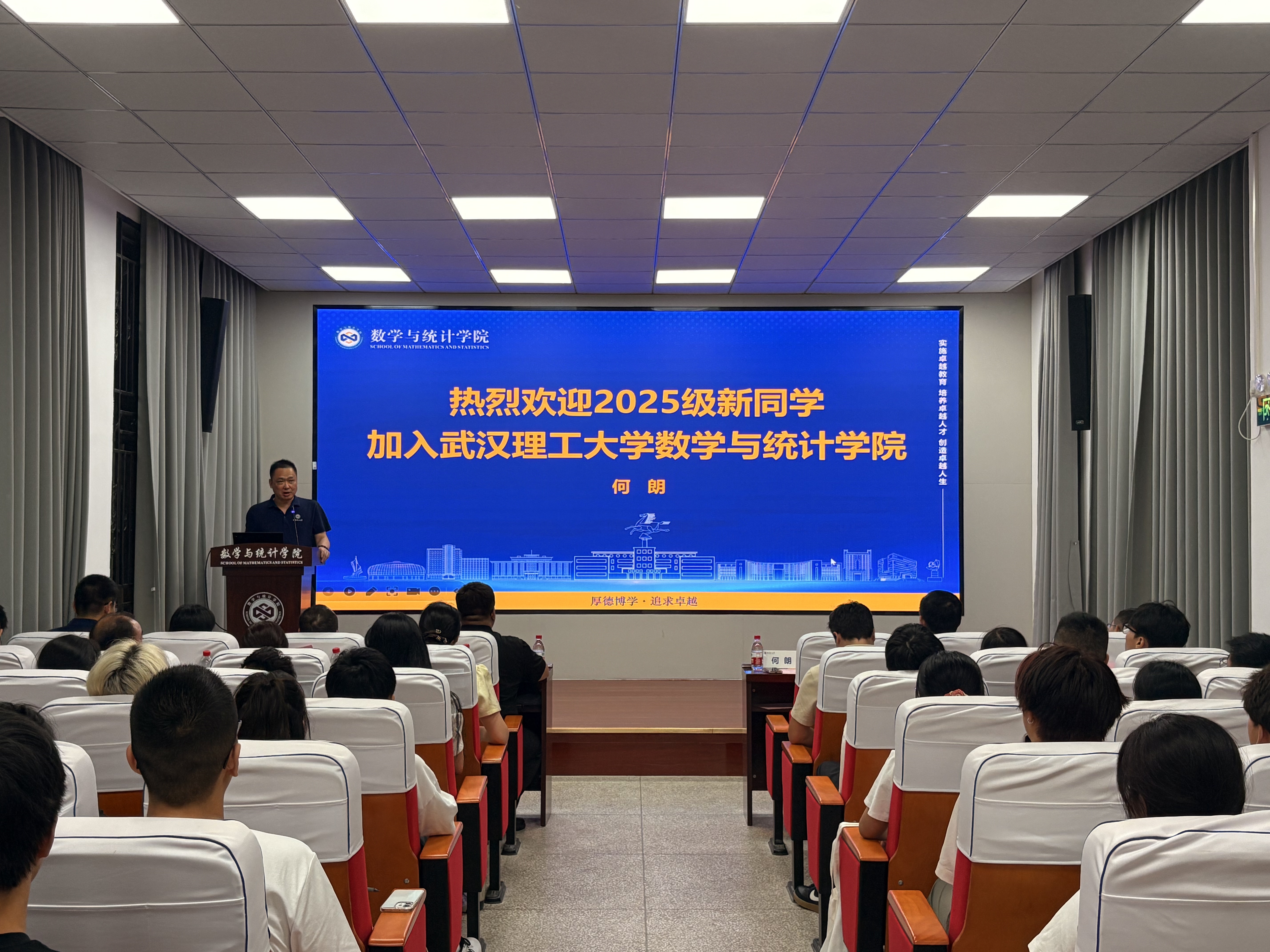 开学典礼在庄严的国歌声中拉开序幕。何朗院长代表学院向全体新生表达了诚挚欢迎,为同学们讲授了“开学第一课”。何院长介绍了学院发展历程及人才培养成效,针对人才培养指出要对接国家需求,与国家战略保持同频共振,并勉励新生珍惜大学时光,早日制定人生规划,树立高远志向,拓宽学术视野,在数学与统计的广阔天地中追求卓越、成就自我。