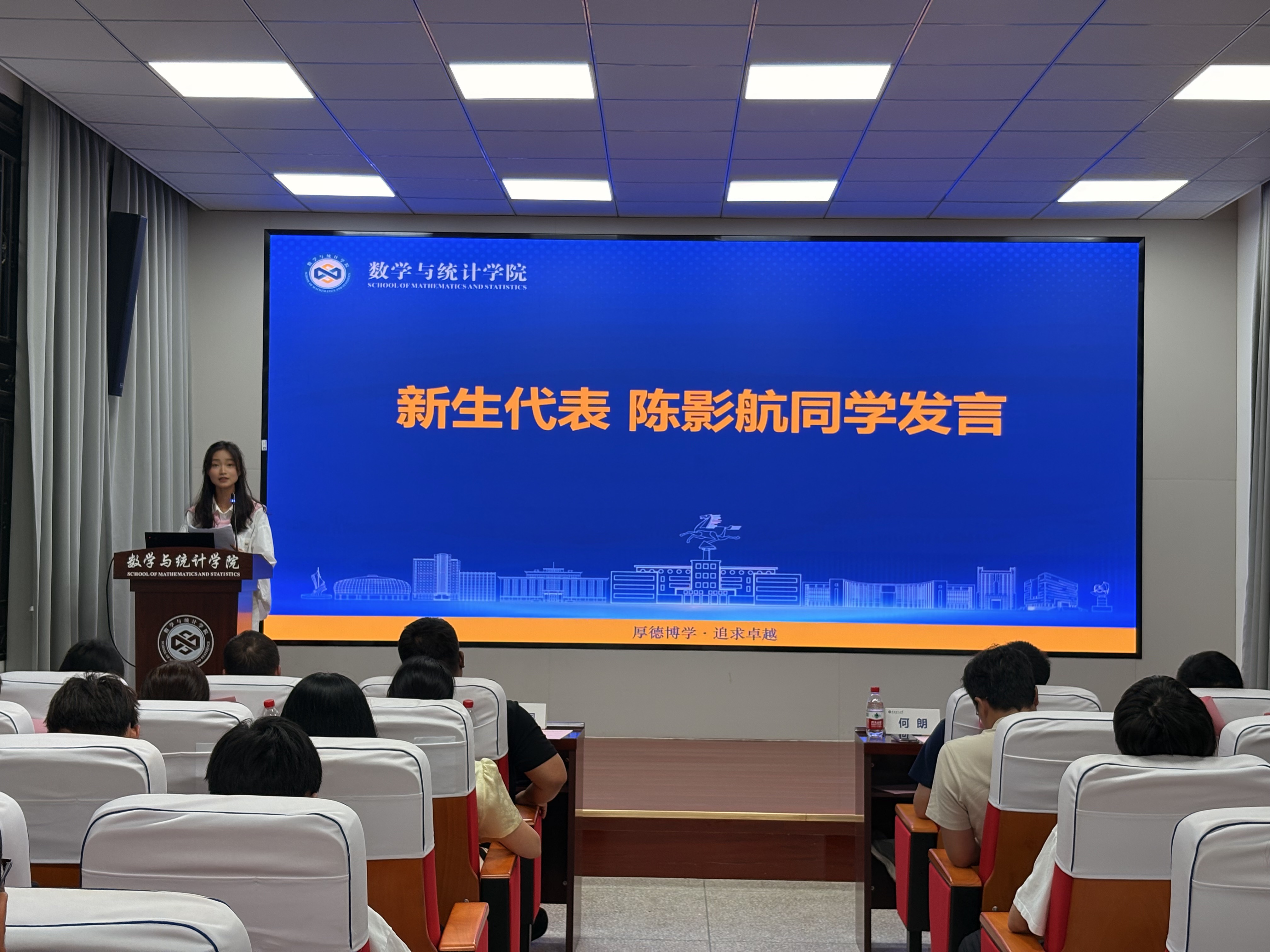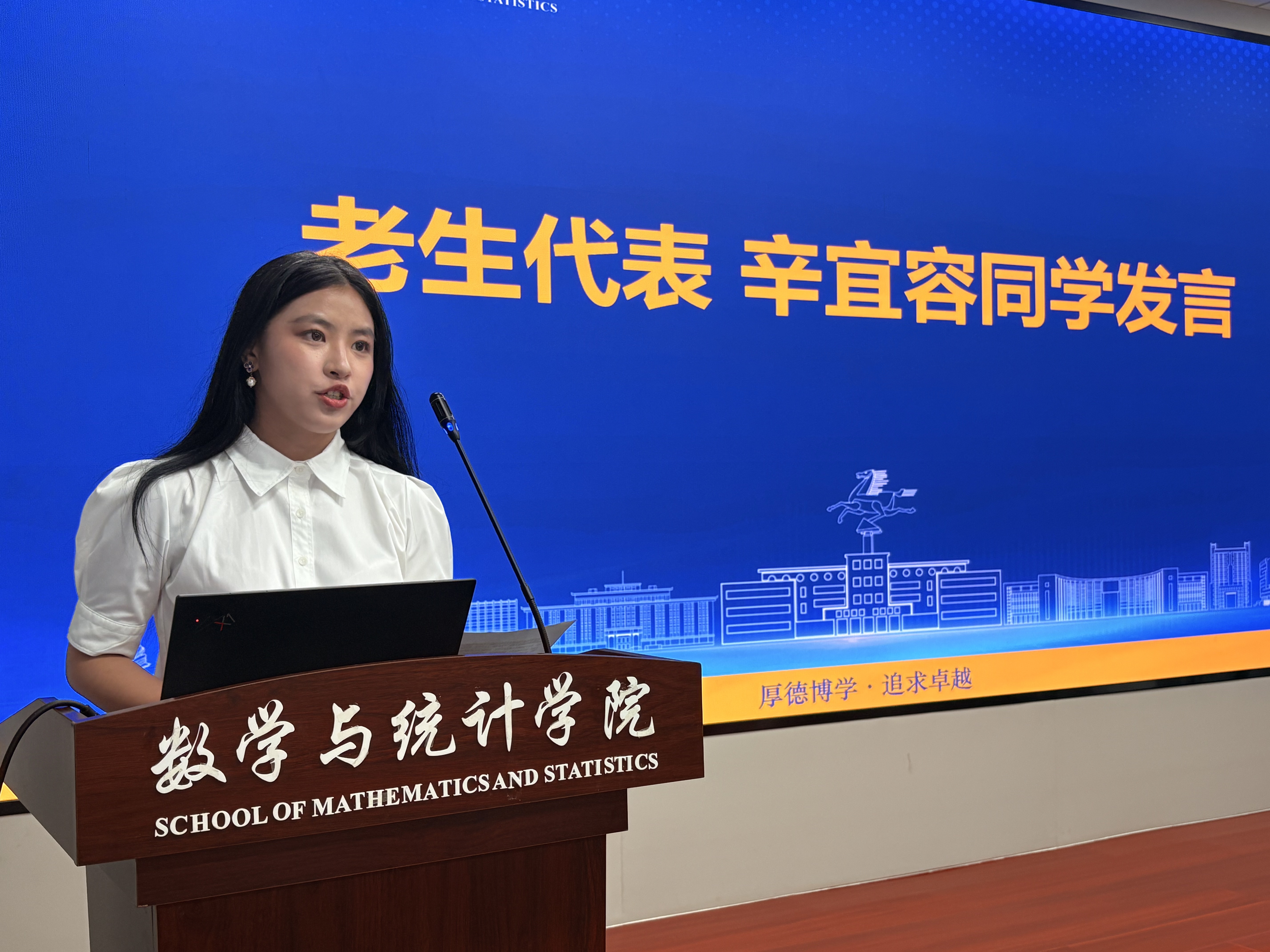 2022级本科生辛宜容作为优秀老生代表,以“在试错中成长,用数学服务国家”为主线,分享了自己在本科阶段的学习心得与实践感悟。她鼓励新生勇于试错、扎实学习,将数学思维与统计方法应用于科技实践,响应国家基础研究需求,贡献时代。