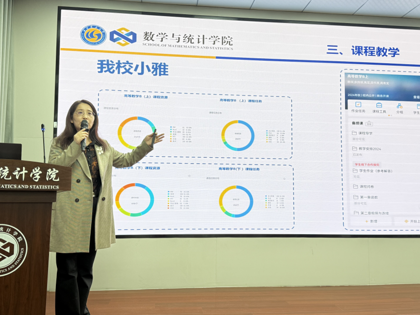 本次研讨会邀请了学院韩华教授担任“师德讲坛”主讲人。韩老师结合自己数十年的从教心得与育人感悟,进行了情真意切的分享。作为教学创新的先行者,她身先士卒,带领高等数学B教学团队率先建成慕课,并充分利用大数据、人工智能等现代技术为课程赋能,在小雅平台、中国大学MOOC等平台建立了完备的线上课程体系,实现了优质教学资源的广泛共享。 她将这一探索实践与师德内涵相结合,以生动的案例阐述了如何将知识传授、能力培养与价值引领有机融合,展现了新时代教师恪尽职守、勇于创新的风采,其宝贵的经验为在座教师提供了深刻启迪。